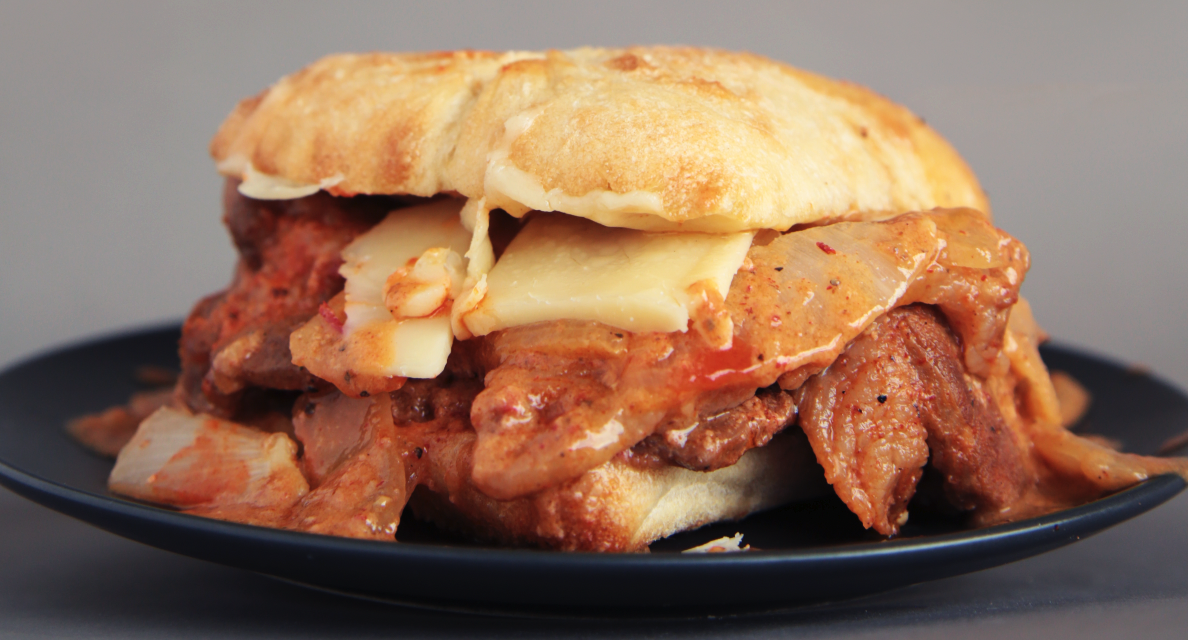 A street food classic, featuring thinly sliced marinated pork, seasoned with garlic and paprika, sandwiched between a crusty bread roll. This flavorful and sandwich is a popular choice, offering a satisfying combination of tender, spiced pork and the satisfying crunch of the bread.
